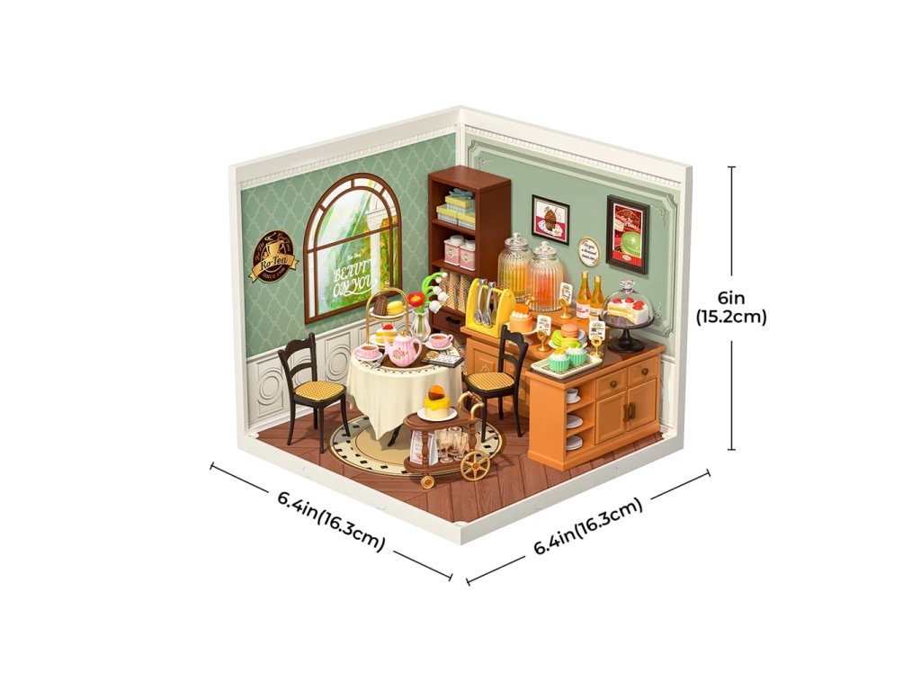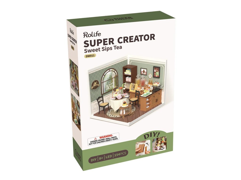 Máte chuť na čaj? Vítejte ve stylové vintage čajovně se zelenkavými stěnami se starožitným vybavením a detaily, jako jsou posezení s kulatým stolkem s krajkovým ubrusem, hrnečky, talířky, sladkosti a mnoho dalšího. Vychutnejte si atmosféru klidu umocněnou vůní čerstvě uvařeného čaje a upečených dobrot. Spojením různých miniatur řady Super Creator Series vertikálně nebo horizontálně můžete vytvořit různorodý komplex domečků. Ochraňte svůj výtvor pomocí krytů proti prachu a nečistotám – DWP05 Dveře proti prachu B a DWP02 Střecha typu B. Skládání skládačky podporuje rozvoj jemné motoriky, prostorového myšlení a trpělivosti. Je to možnost, jak kombinovat zábavu se vzděláváním. Všechny přesné dílky do sebe lehce zapadnou, aby výsledek byl stabilní a odolný, a to bez použití lepidla. Skládačka je dodávána v nesloženém stavu, zabalená v krabici s podrobným návodem k sestavení. Hlavní vlastnosti: 154 dílkůdoba skládání 1 hodLED osvětleník napájení slouží kabel USB-C (je součástí balení)sestavení bez použití lepidlavýjimečný vzhledvhodné pro děti i dospělérozvíjí logické a motorické dovednostipodporuje trpělivost dětíideální jako dárek nebo jedinečná dekoracemožnost spojení více miniaturk dokoupení kryty proti prachu – DWP05 a DWP02