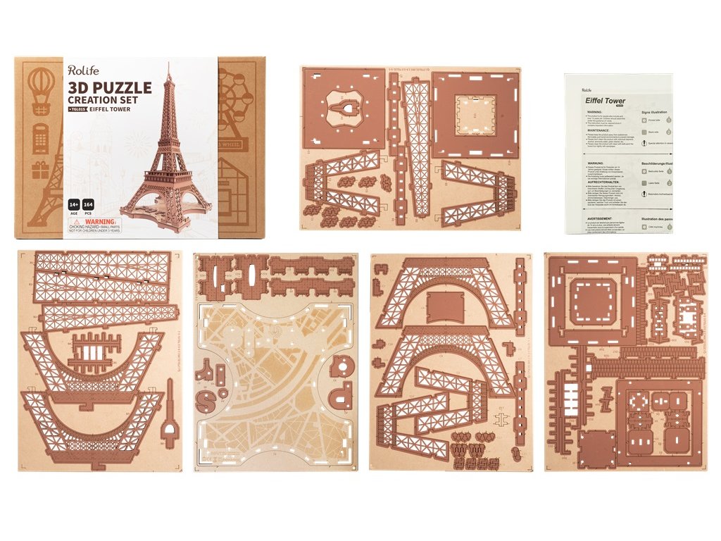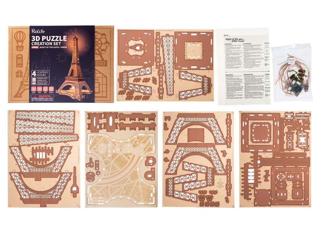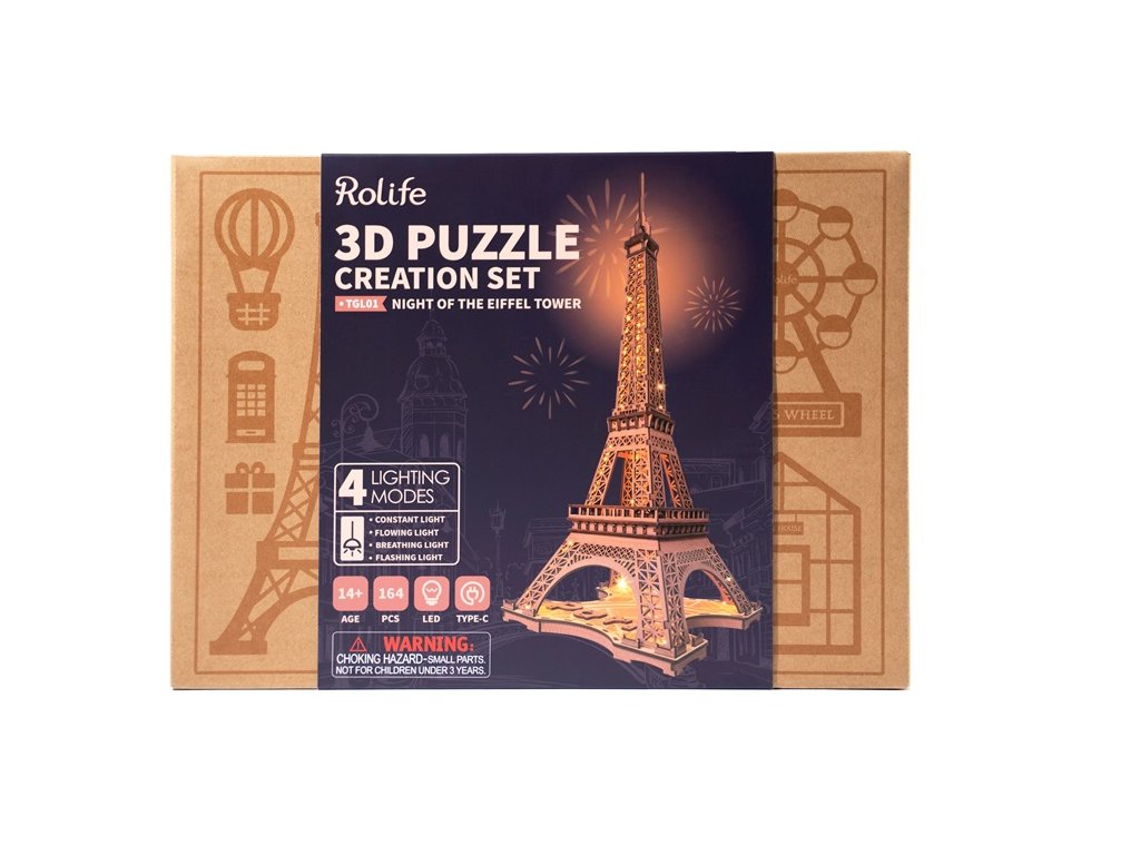 Někdy to vypadá, že do Paříže se prostě nedostaneme dost často. Jaké by to bylo, kdybyste mohli mít kousek romantické Paříže ve svém obývacím pokoji? Představujeme vám 3D Dřevěné puzzle Rolife Noc Eiffelovy věže. Skrze toto puzzle můžete cestovat časem až do roku 1889 a pocítit sílu a nádheru nejslavnější francouzské architektury. Tato replika Eiffelovy věže je zmenšeninou v měřítku 1:638 a zachovává veškerou krásu a genialitu originálu. Naši řemeslníci se pečlivě drželi původního designu ikonické mřížové architektury a 4dílné struktury, aby vytvořili tento model s vzhledem rezavého tepaného železa. Ale to není vše! Toto dřevěné 3D puzzle Rolife také obsahuje čtyři režimy osvětlení, které dodávají snovou a romantickou atmosféru, která se hodí k tajemné noci v Paříži. Představte si, jak se postupně budujete tento model, přičemž každý kus překližky přeřezávaný laserem zapadá na své místo. Jak se s každou přidanou částí ponoříte hlouběji do doby, kdy byla Eiffelova věž postavena. V duchu cítíte vibrace Paříže, slyšíte šum ulic a vůni čerstvého bagetu. A pak, jakmile je model hotov, zapnete osvětlení a najednou máte svůj vlastní malý kus Paříže přímo doma a zažijte radost z vytvoření vlastního mistrovského díla. Dodáváno v kartonové krabičce s detailním návodem k sestavení. Upozornění: Není vhodné pro děti do 3 let, protože obsahuje malé součásti – hrozí nebezpečí udušení. Balící materiál není hračka. Hlavní vlastnosti: 164 precizně vyřezávaných dílůstřední obtížnost sestaveníLED osvětlenímateriál dřevovhodné od 14 let