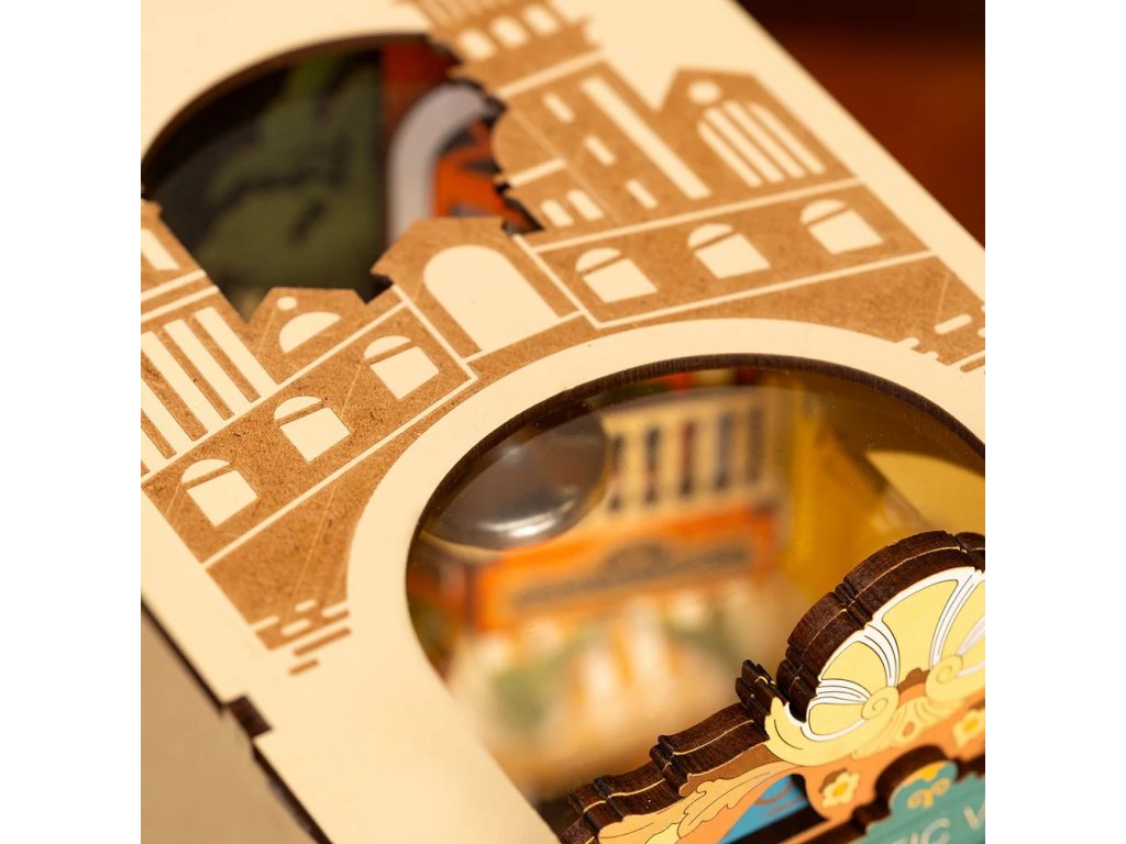 Kousek italského životního stylu a historie u Vás doma. Vneste kousek Itálie mezi své knihy. Představte si romantickou projížďku lodí Benátským kanálem mezi italskými památkami. Toto DIY puzzle vám umožní vlastnit kousek města, protože zobrazuje proslulou gondolu, Canal Grande, Teatro La Fenice, obchod s maskami a kavárnu. Zarážka na knihy byla navržena s takovou precizností a autenticitou, že zachycuje klid města v malém knižním koutku. Benátský kanál je úžasně vyobrazen pomocí průhledného plastu, díky kterému je vodní efekt realističtější. A tento nádherný pohled ještě umocňuje LED osvětlení. Tato zarážka na knihy je z přední i horní strany chráněna před prachem a nečistotami průhlednou fólií. Zacvakávací díly usnadňují identifikaci při jejich skládání. Ideální dárek pro zvláštní příležitost nebo vhodné jako dekorační předmět do Vaší knihovny. Osvětlení pomocí LED je ovládáno moderním dotykovým spínačem a všechny jeho součásti jsou přizpůsobeny ke snadné vestavbě. Mikrotužkové baterie potřebné k napájení nejsou součástí stavebnice. Dodáváno s podrobným návodem k sestavení. Hlavní vlastnosti: efekt plovoucího městasnadná montáž s přesnými díly bez použití lepidlaideální dárek nebo dekoracepodporuje logické a motorické dovednostitrénuje trpělivost dětíLED osvětleníhrdost z dokončení