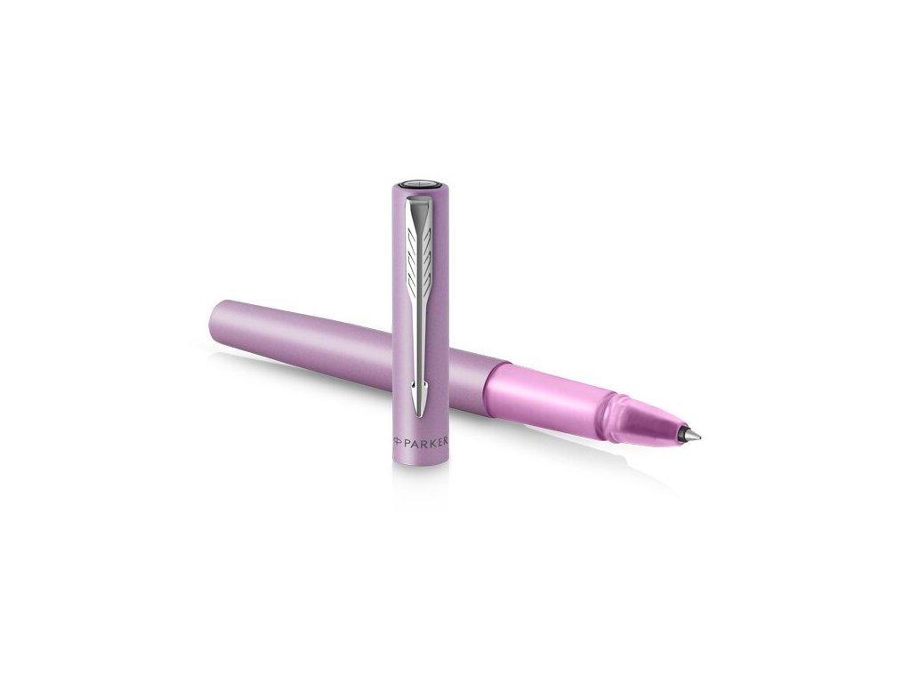 Roller Parker Vector XL s mosazným tělem a víčkem se saténovým metalickým lakem v kombinaci s chromovými doplňky. Úchopová část pera je transparentní. Roller v barvě lilac - šeřík.