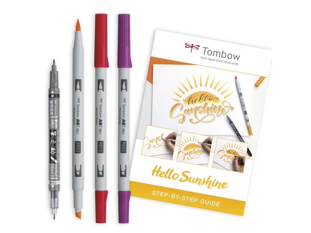 Sada Sunny Lettering Set obsahuje základní výbavu pro lettering s lihovými fixy ABT PRO. V návodu, který je součástí balení, umělkyně Katharina Arends (@letterbraut) vysvětluje, jak pomocí výrobků z této sady vytvářet nápisy s monochromatickými efekty i pestré barevné přechody.