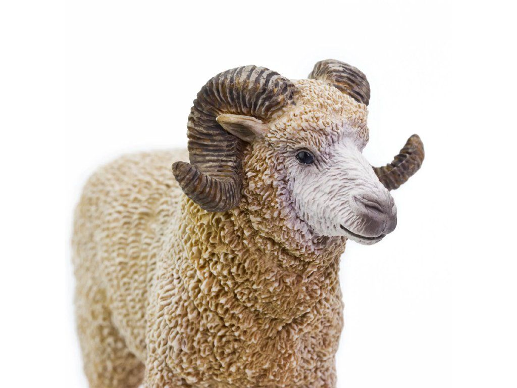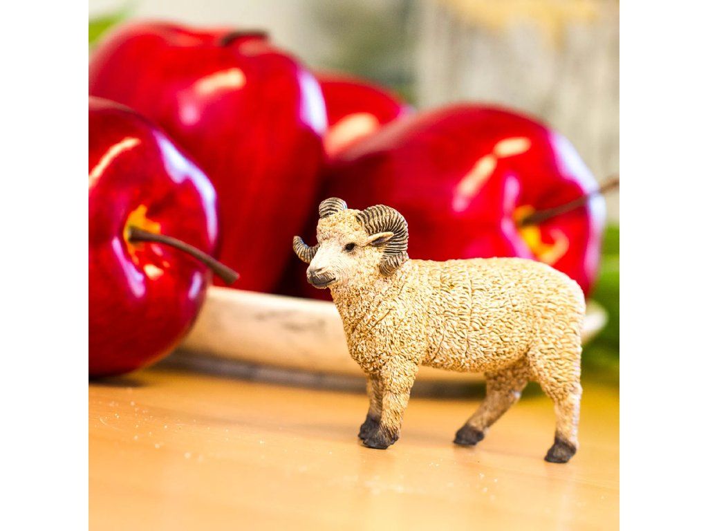 Figurka krásného berana se zatočenými rohy. Tento beran žije převážně v Kouřových horách Severní Ameriky.