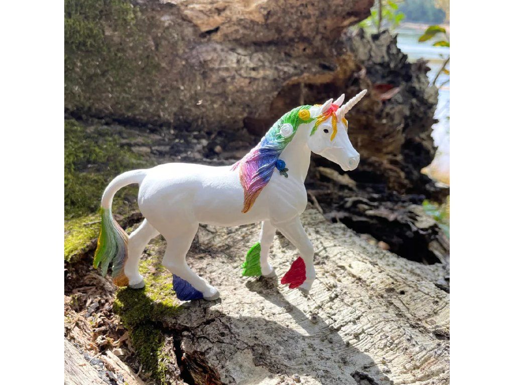 Figurka duhového jednorožce, který se objevuje jen ve výjimečných příležitostech. Tento duhový jednorožec má bílou srst, perleťový roh a zářivé, jiskřivé duhové zbarvení hřívy, ocasu a opeření nohou.