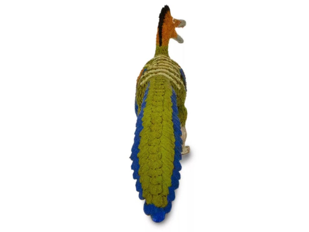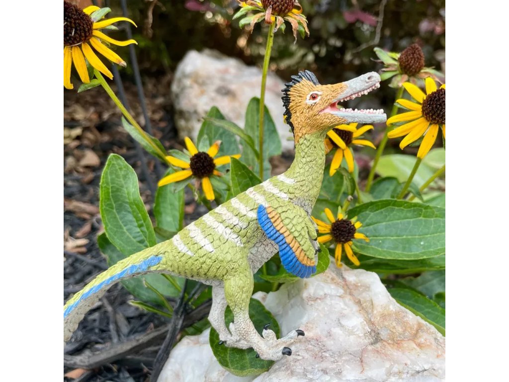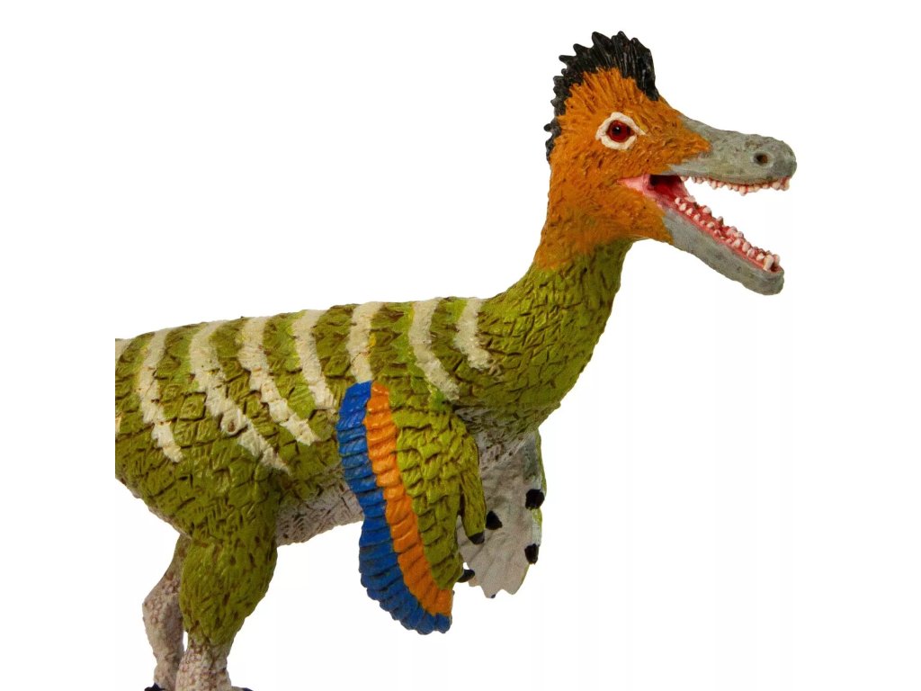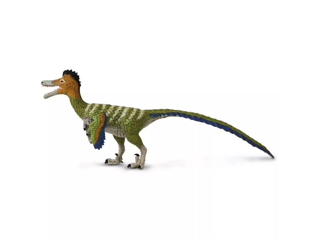 Figurka Austroraptora, velkého příbuzného Velociraptora, Deinonycha a Utahraptora, který mohl dorůst délky až 20 stop. Ve srovnání s jinými velkými dravými dinosaury byl štíhlejší. Tato realistická a vědecky přesná figurka Austroraptora předvádí dinosauří úzké čelisti a štíhlou stavbu. Stejně jako ostatní dravci je i tento pokrytý peřím a dokonce má na hlavě malý opeřený hřeben. Je zbarven do zelené, modré a světle hnědé barvy, s černým hřebenem a krémově zbarvenými pruhy na zádech.