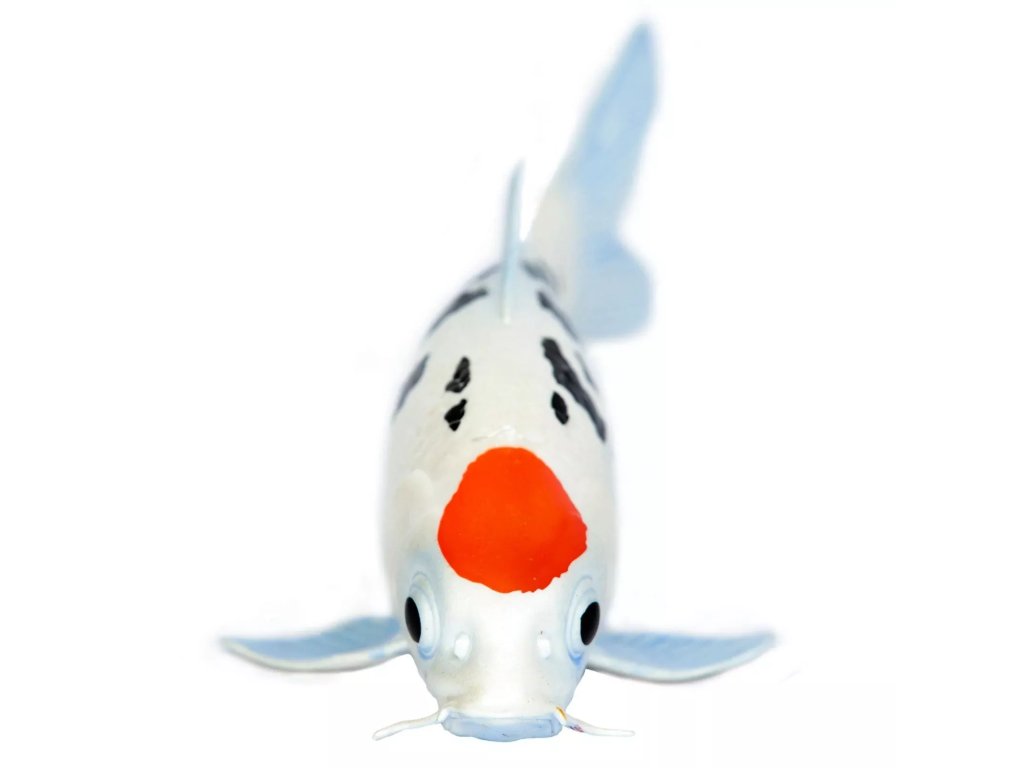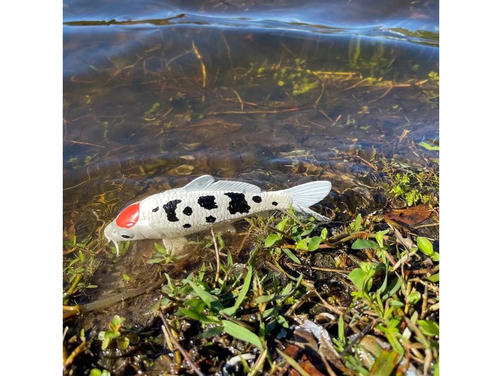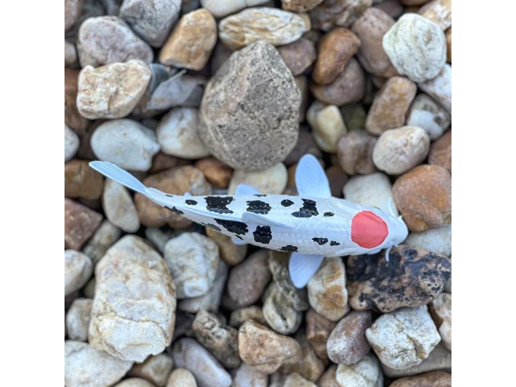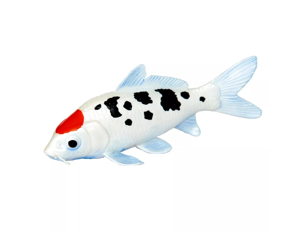 Figurka Koi kapra, jednoho z nejpopulárnějších chovaných a nejznámějších druhů ryb. Koi kapr je ruh kapra, který se často chová pro dekorativní účely v rybnících a zahradách, je oblíbený pro svou širokou škálu barev a vzorů (mohou být bílé, černé, červené, žluté, modré a další).