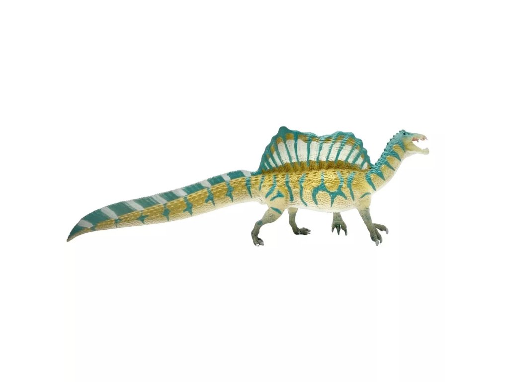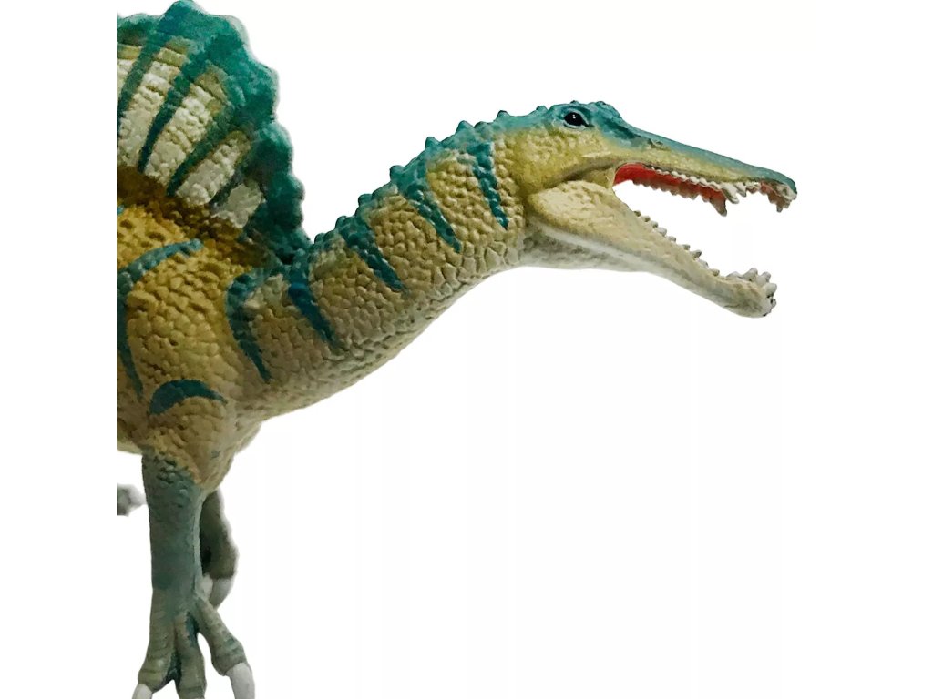 Figurka Spinosaura, velkého rybožravého dinosaura nalezeného v Egyptě a Africe. Spinosaurus byl poprvé objeven v roce 1915 a byl často zobrazován jako normální teropod (dinosaurus pojídající maso) s velkou zaoblenou plachtou na zádech. Nedávné objevy ukázaly, že měl nejen užší, krokodýlí tvář, ale měl mnohem kratší nohy, než se dříve myslelo, a dokonce velkou ploutev, která se táhla po délce jeho ocasu.