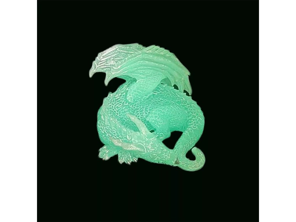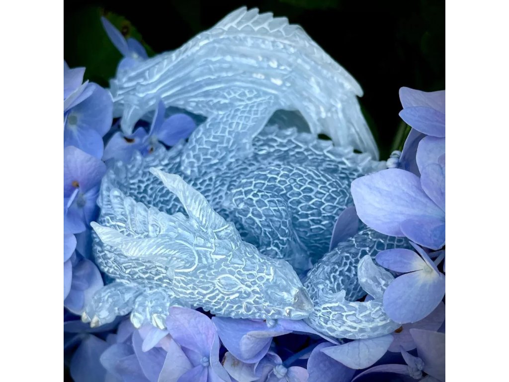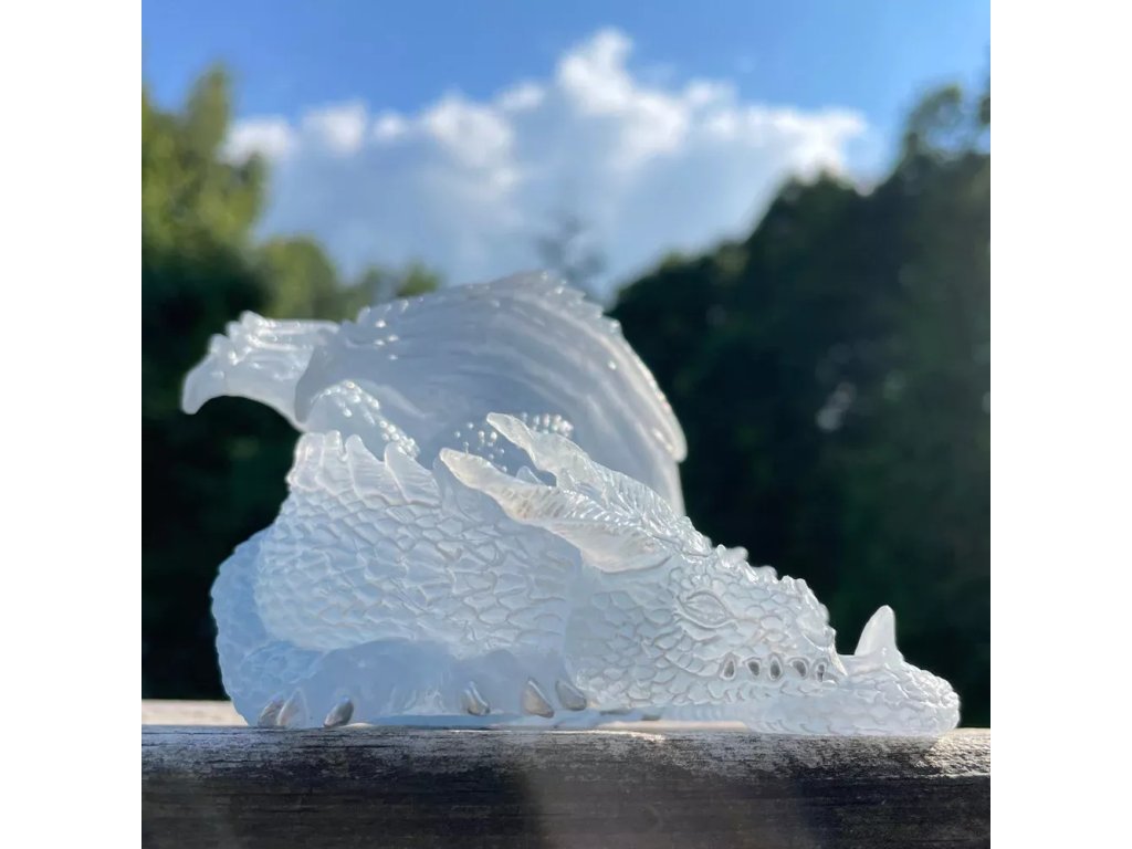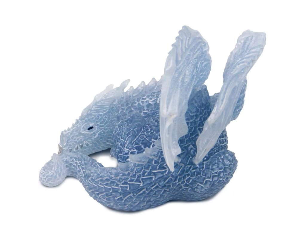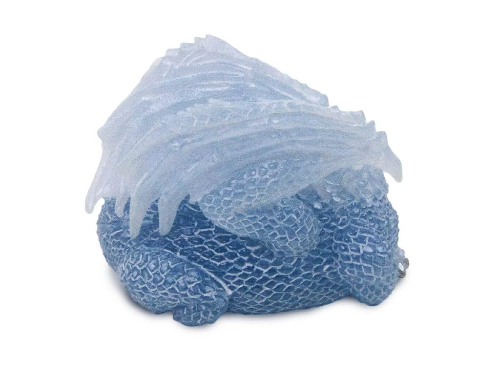 Figurka Ospalého draka, schouleného v klidné spící póze. Jeho tělo je chladné, světle modré barvy s průsvitným pocitem a ve tmě po vystavení světlu silně září.