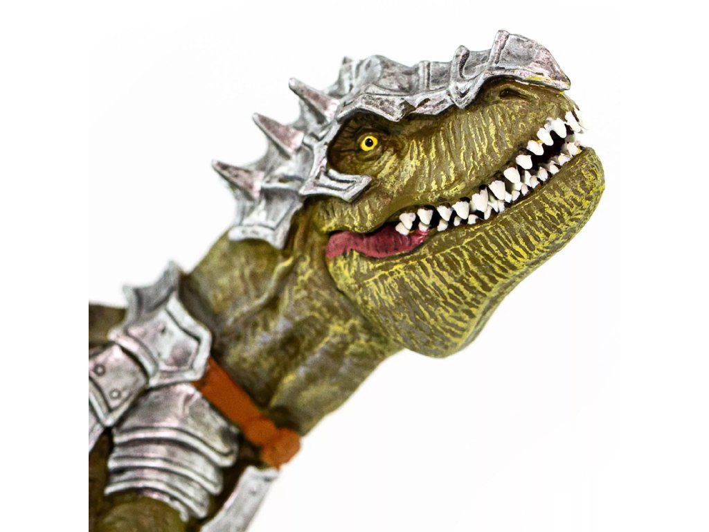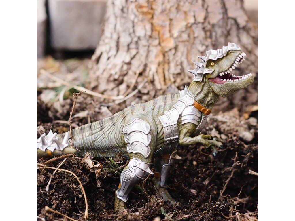 Figurka obrněného T-Rexe, největšího predátora všech dob, který se stal ještě děsivějším díky plátům ostnatého brnění, které mu chránily hlavu, nohy, hruď a ocas.