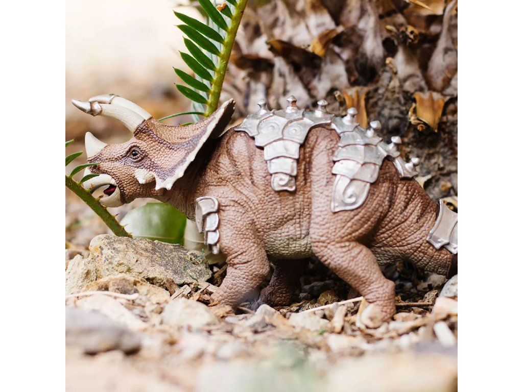 Figurka obrněného Triceratopse, který nyní zvýrazňuje svou již tak impozantní přírodní výzbroj s paličkovaným ocasem a novým lesklým brněním, které chrání jeho záda a boky.