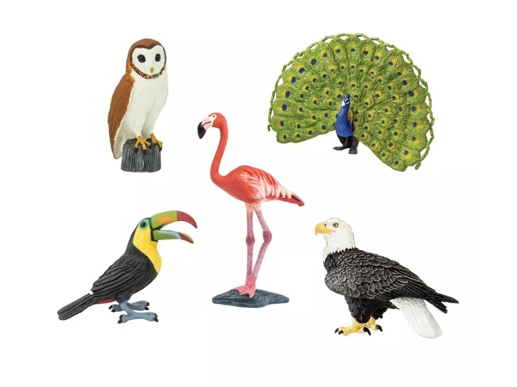 Balíček celkem 5 replik ptáků, ve kterém naleznete tukana, sovu, plameňáka, orla bělohlavého a páva. Všechny figurky ekologické značky Safari Ltd. jsou ručně zpracované, netoxické, neobsahují škodlivé olovo, chemikálie, ftaláty, ani BPA.