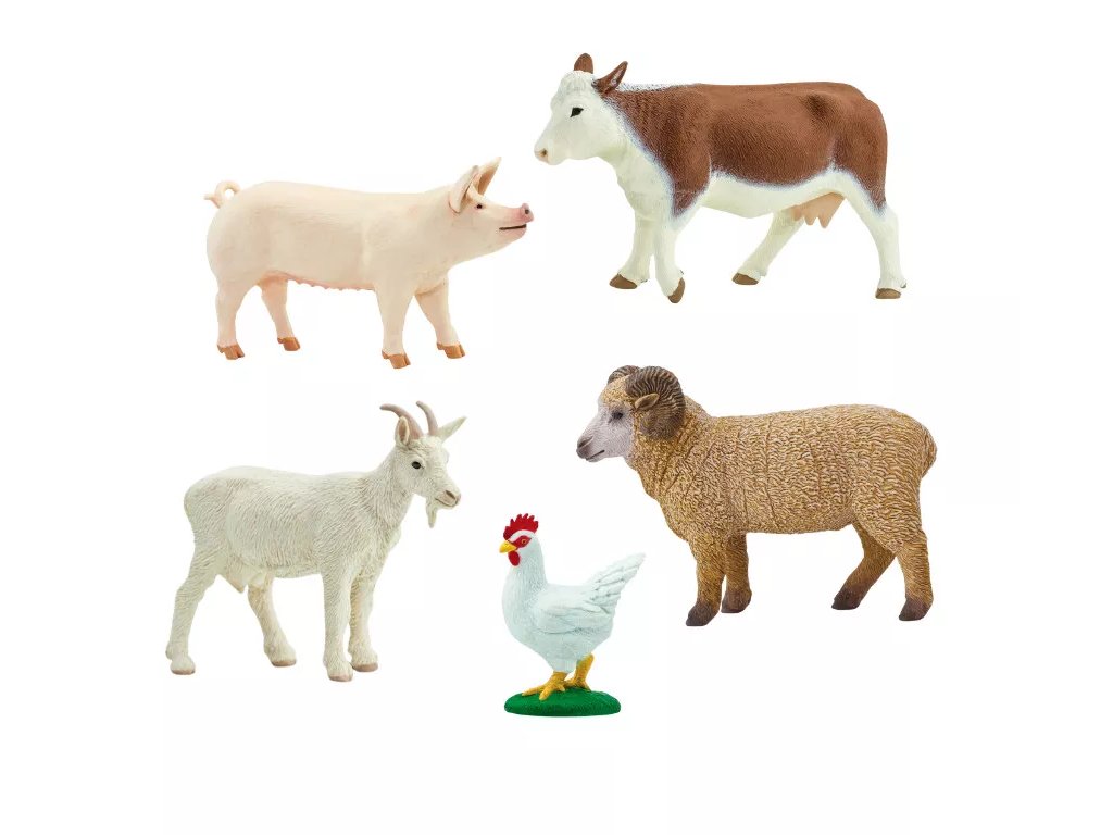 Balíček replik zvířat s názvem Statek od firmy Safari Ltd., v kterém najdete krávu, slepici, kozu, berana a prasnici.