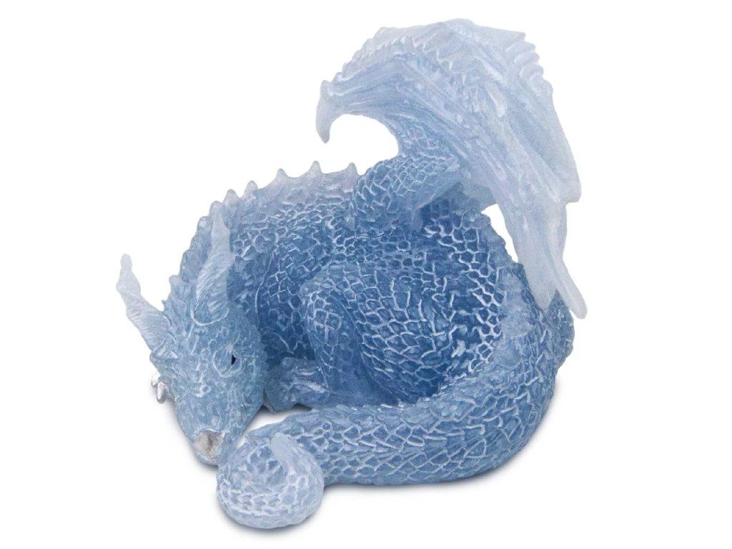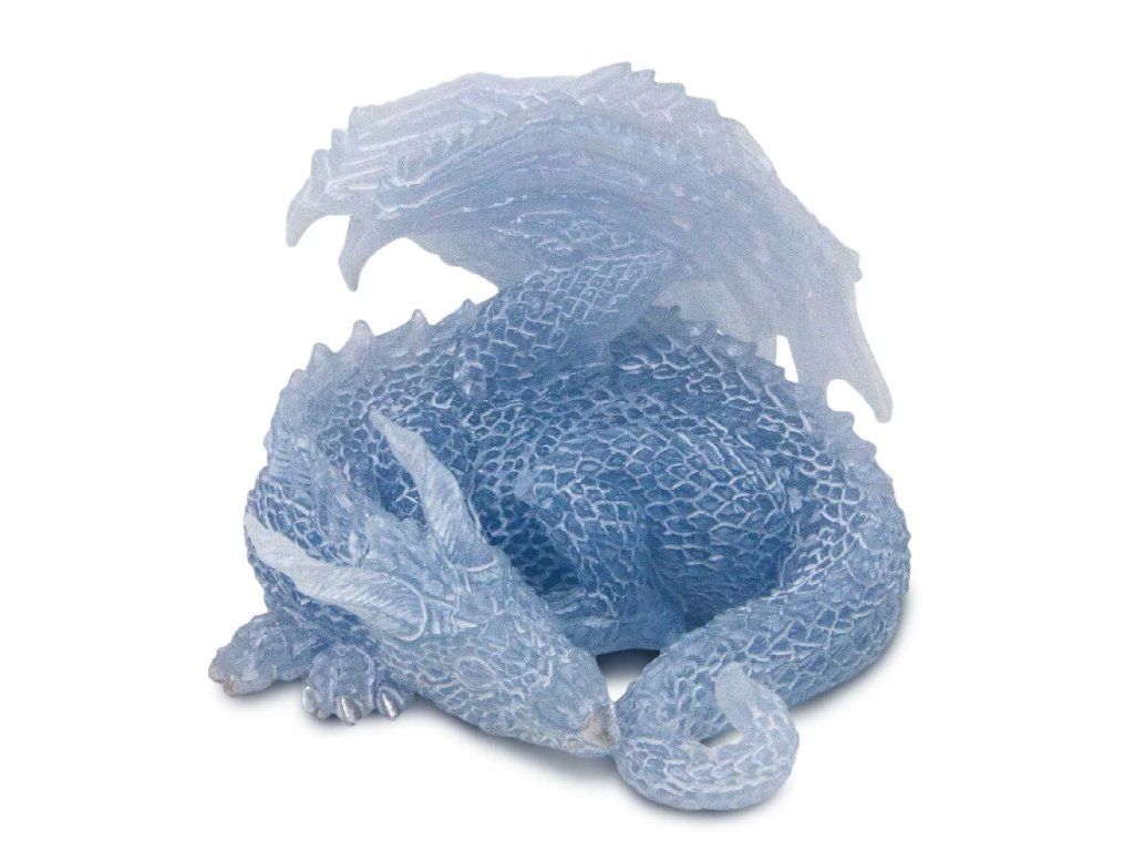 Figurka Ospalého draka, schouleného v klidné spící póze. Jeho tělo je chladné, světle modré barvy s průsvitným pocitem a ve tmě po vystavení světlu silně září.