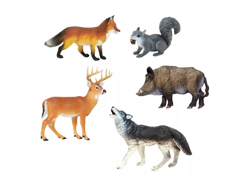 Balíček replik zvířat s názvem V lese od firmy Safari Ltd., v kterém najdete jelena, kance, lišku, vlka a veverku.