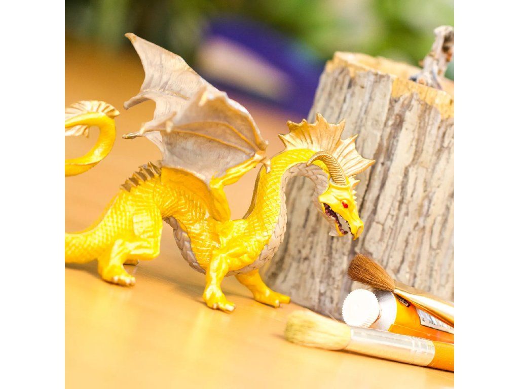 Figurka Zlatého draka, vzácného čínského rohatého draka s křídly. Zlatí draci žijí v horách východní a střední Asie, kde jim jejich křídla umožňují snadné cestování. Nejpřesvědčivější charakteristikou zlatého draka je samozřejmě jeho barva, ale brilantní jiskra skrývá jemné detaily, jako jsou úzce spojené šupiny, velké rohy a ohromný hřebínek.