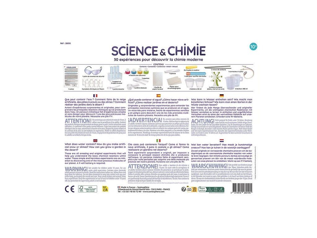 | Upozornění: | POZOR! Nevhodné pro děti do 10 let. Pro použití pod dohledem dospělé osoby. Obsahuje některé chemické látky, které představují nebezpečí pro zdraví. Před použitím si přečtěte návod k použití, dodržujte jej a uschovejte si jej. Nedovolte, aby se chemikálie dostaly do kontaktu s jakoukoli částí těla, zejména s ústy a očima. Udržujte malé děti a zvířata mimo dosah pokusů. Experimentální sadu uchovávejte mimo dosah dětí mladších 10 let. Ochrana očí pro dohlížející dospělou osobu není součástí balení. |