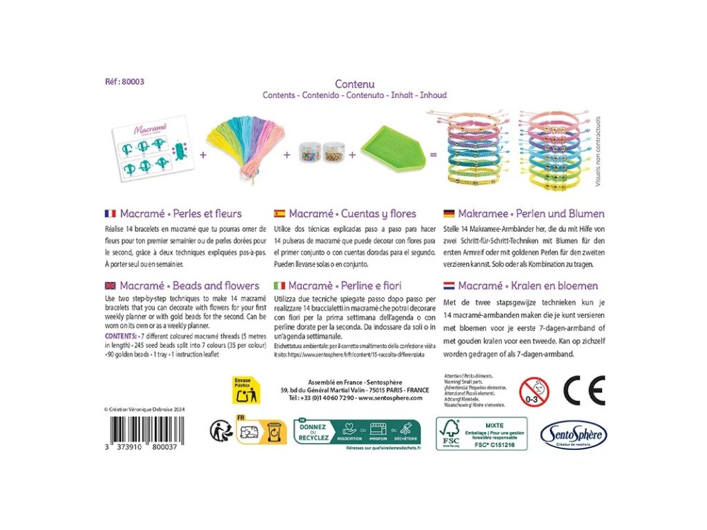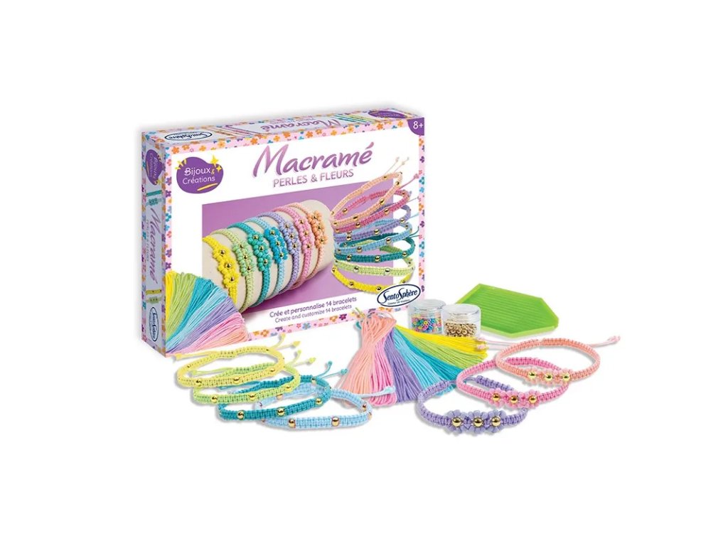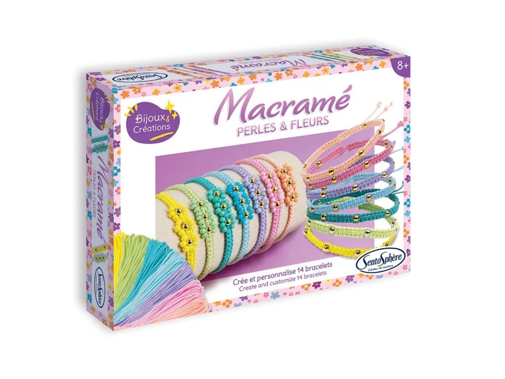 Kreativní sada Výroba náramků - Macramé, pocházející z dílny oblíbené francouzské značky Sentosphere, obsahuje vše, co potřebujete k vytvoření úžasných pastelových macramé náramků!