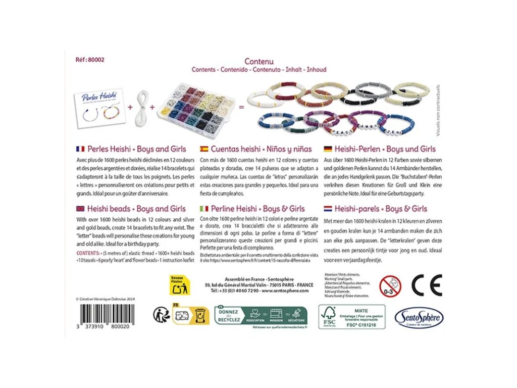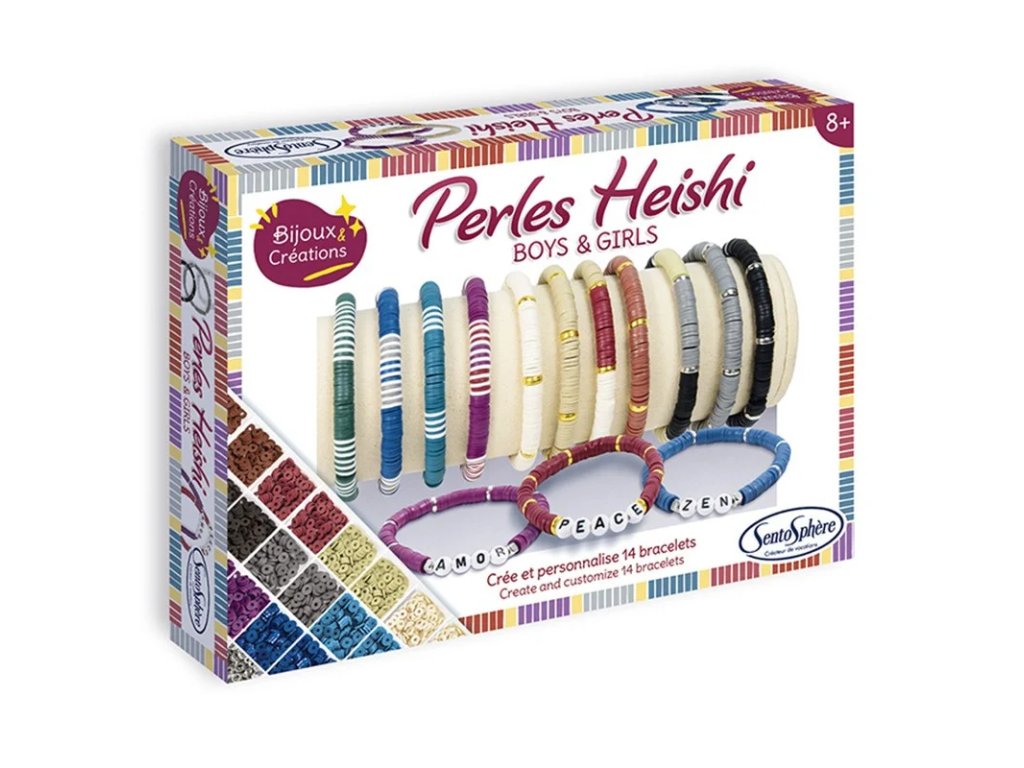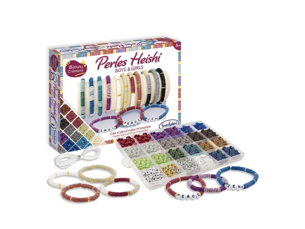 V sadě na vás čeká více než 1600 korálků heishi ve 12 barvách na výrobu více než 14 náramků ozdobených krásnými zlatými a perleťovými korálky. Skvělá aktivita pro rozvoj jemné motoriky a koordinace oko-ruka, trpělivosti, logického uvažování a kreativního myšlení.