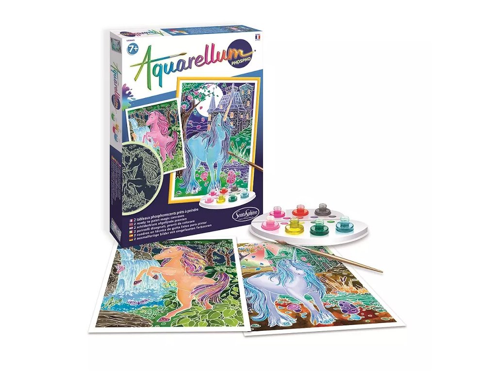 Fosforeskující akvarely jsou založeny na technice kresby na speciálním papíru. Vzory se objevují jakoby magií, jednotlivé barvy se do sebe nevpíjí. Barvy jsou syté a kontury se ve tmě rozsvítí. Ideální činnost, při které se děti seznámí s uměním tím, že porozumí míchání barev, stimulují představivost a koncentraci.
