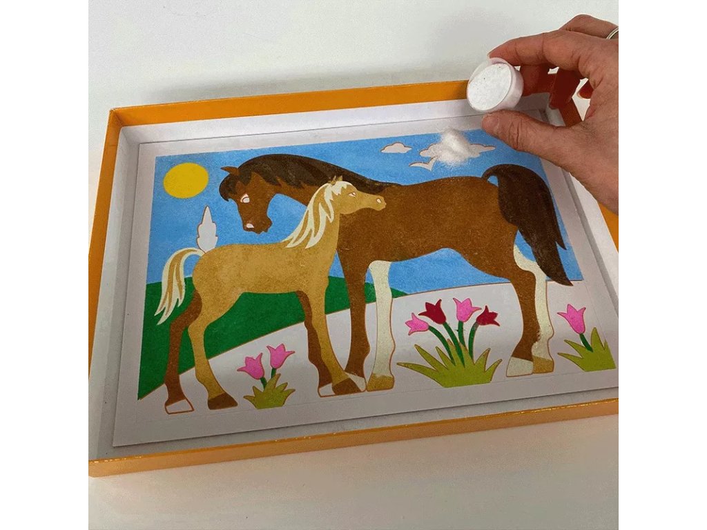 S touto sadou mohou oživit vznešené koně i ti nejmenší, a to bez svého zašpinění. Vyberte si obrázek některého z nabízených koní a můžete začít. Pískové tvoření potěší všechny děti, které mají rádi kreativní tvorbu, malování, a nebo pouze chtějí vyzkoušet něco nového. Je to snadné, stačí odlepit předlepené povrchy jednotlivých obrázků a posypat je různými barvami písku.