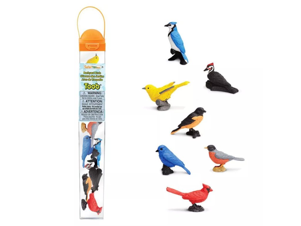Tuba Ptáci obsahuje 7 replik o velikosti 4-7,5 cm a zahrnuje následující ptáky, které lze vidět běžně na zahradách: datel, papežík indigový, červenka, žluva, lesňáček, kardinál a sojka chocholatá.