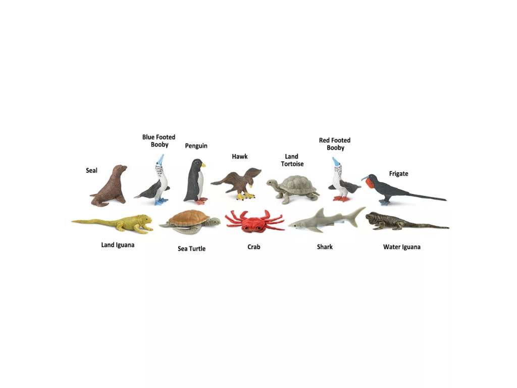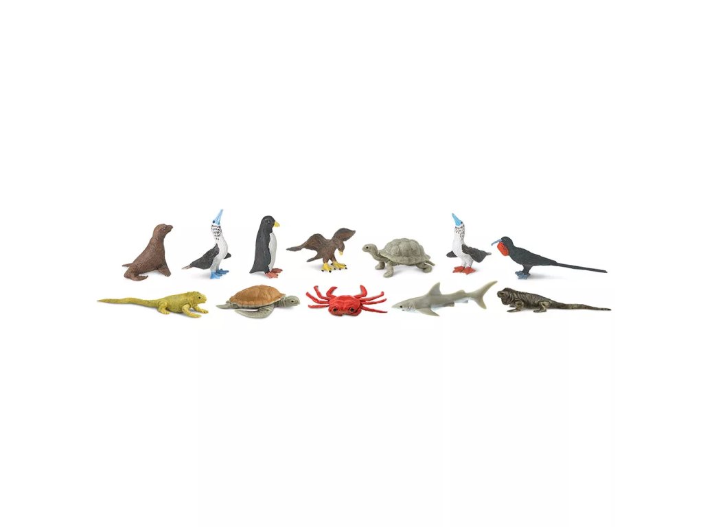 Tuba obsahuje 12 figurek zvířat z Galapág: tuleně, tereje modronohého, tučňáka, jestřába, suchozemské želvy, tereje červenonohého, fregatky, leguána suchozemského, mořské želvy, kraba, žraloka a leguána vodního.