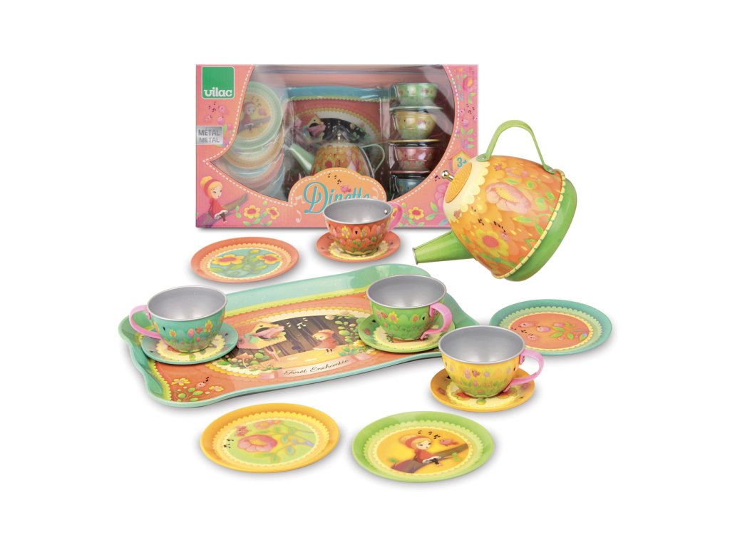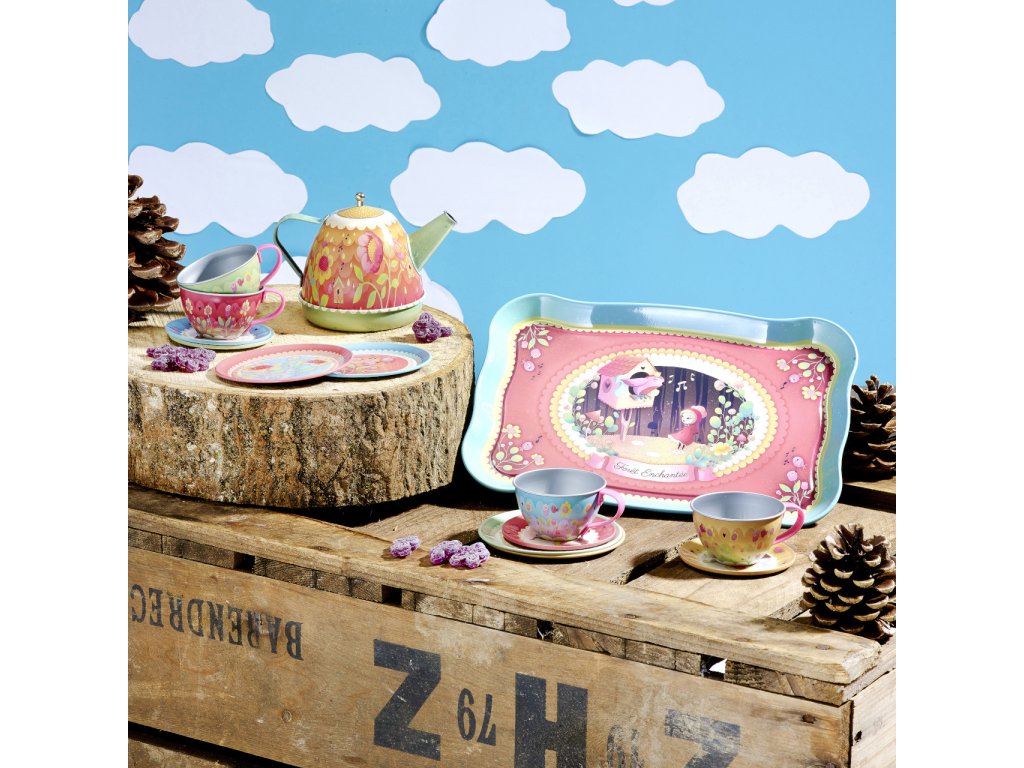 Kovový set nádobí s krásnou pohádkovou ilustrací „magického lesu“, s podtáckem. Tento set je speciální v tom, že při servírování hraje hudbu. V balení najdete 14 ks vybavení: velký tác pro lehký přesun nádobí, 4 hrnečky s podtácky, 4 dezertní talířky a konvičku, která při náklonu začne hrát pěknou melodii. Velikost tak akorát pro dětské ruce. Vyrobeno ve Francii. Hlavní vlastnosti: obsahuje 14 kskovové nádobíkonvice v sobě ukrývá natahovací hrací strojekvyrobeno ve Francii